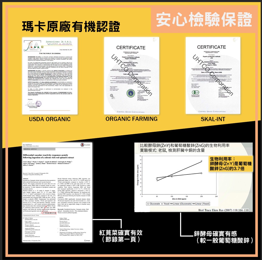 成份:MACAPRO®專利黑紅瑪卡萃取物、專利紅莧菜萃取物、啤酒酵母粉(含維生素B群)、鋅酵母。